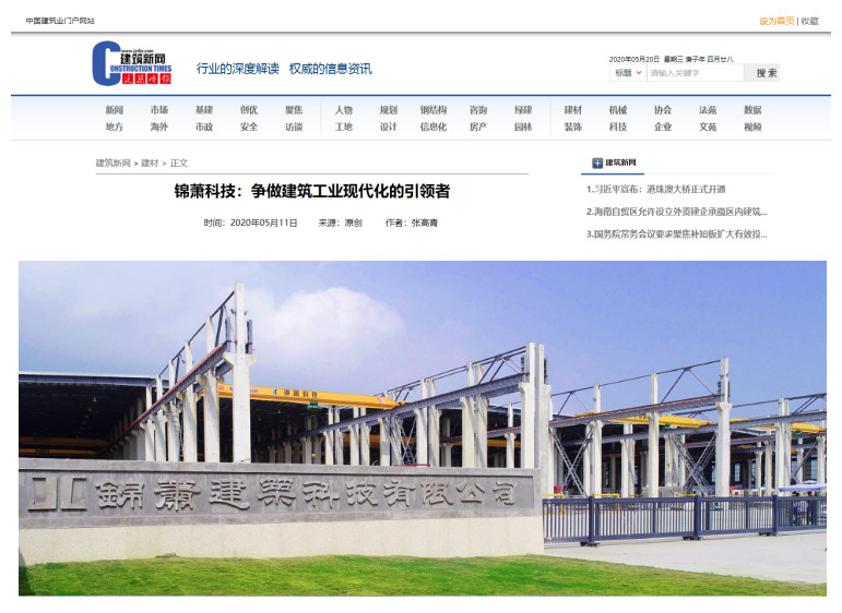 2020年5月18日,《建筑时报》第3724期第5版,刊登了《争做建筑工业现代化的引领者——锦萧建筑科技有限公司走访记》一文,对锦萧建筑科技有限公司进行了大篇幅报道。