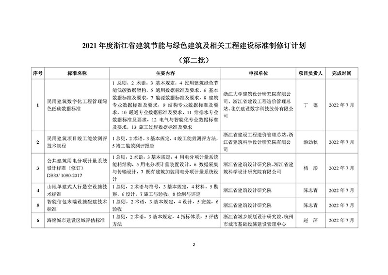 为推进我省建筑节能与绿色建筑及相关工程建设标准的编制工作,充分发挥工程建设标准的引领作用,根据《中华人民共和国节约能源法》《浙江省实施〈节约能源法〉办法》《浙江省可再生能源开发利用促进条例》和《浙江省绿色建筑条例》等有关规定,在自愿申报的基础上,经专家综合评审,我厅确定了2021年度第二批浙江省建筑节能与绿色建筑及相关工程建设标准制修订计划,现予以印发。