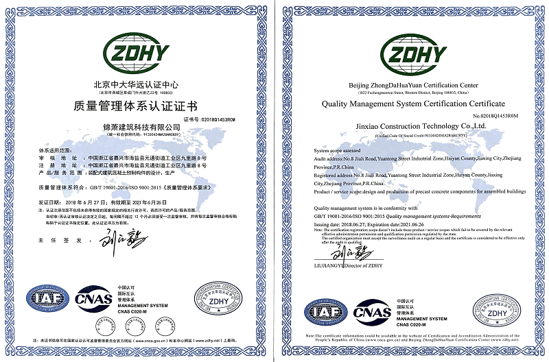 近日,锦萧建筑科技有限公司正式通过了ISO9001:2015质量管理体系认证,并获得认证证书,这标志着公司在产品研发设计、生产及销售服务方面已达到国际化标准,获得了国际权威组织的认可。