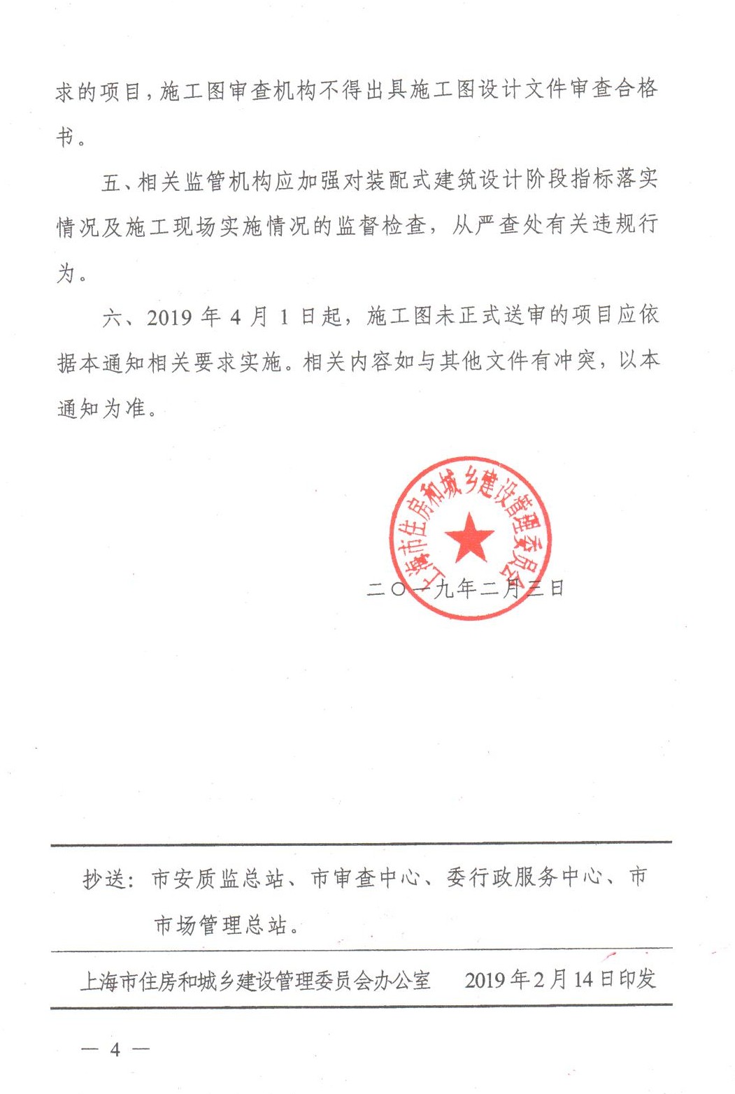 四、施工图审查机构应按照上海市装配式建筑单体预制率和装配率计算细则核对装配式建筑指标,并将指标填写在施工图设计文件审查合格书上。对于达不到规定装配式建筑指标要求的项目,施工图审查机构不得出具施工图设计文件审查合格书。