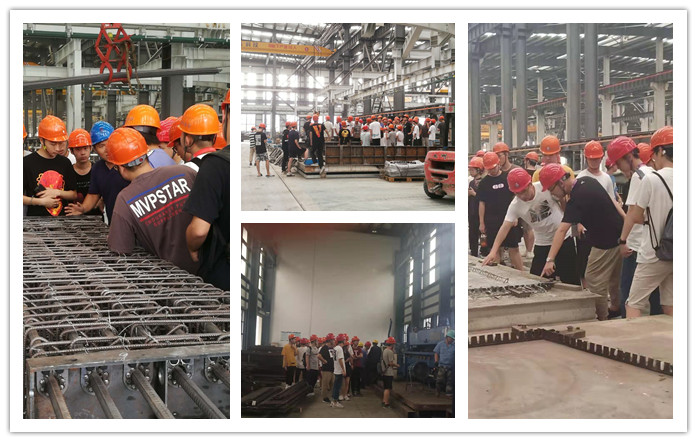 会后,同学们在设计部技术人员的带领下分组有序地进入工厂生产区进行参观学习,重点参观了厂区固定模台生产线、半自动流水线、搅拌站等,直观地了解了预制构件生产、检验等环节。