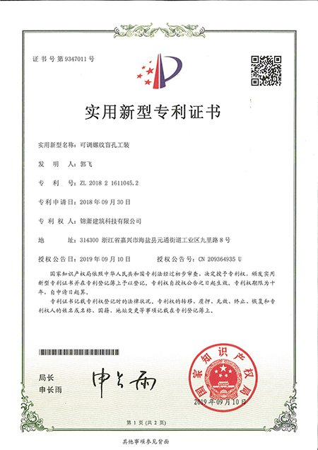 专利证书--可调螺纹盲孔工装
